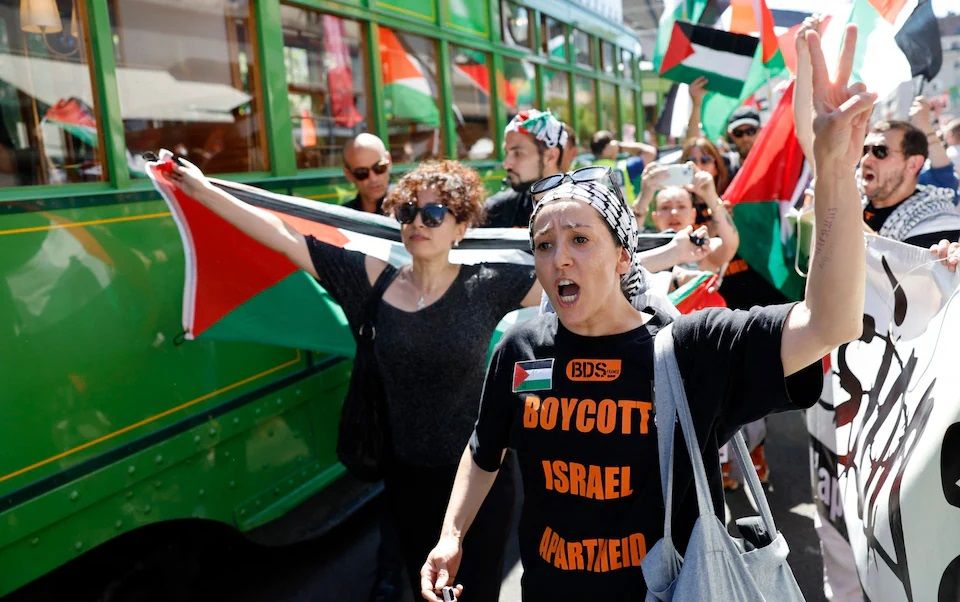 Протестующие держат баннер4 декабря конкурс песни Евровидение переживает «переломный момент», когда члены органа, организующего конкурс, могут проголосовать за вопрос о том, сможет ли Израиль участвовать в 2026 году, при этом некоторые страны угрожают выйти из соревнований, если не будет исключен из-за войны в Газе.